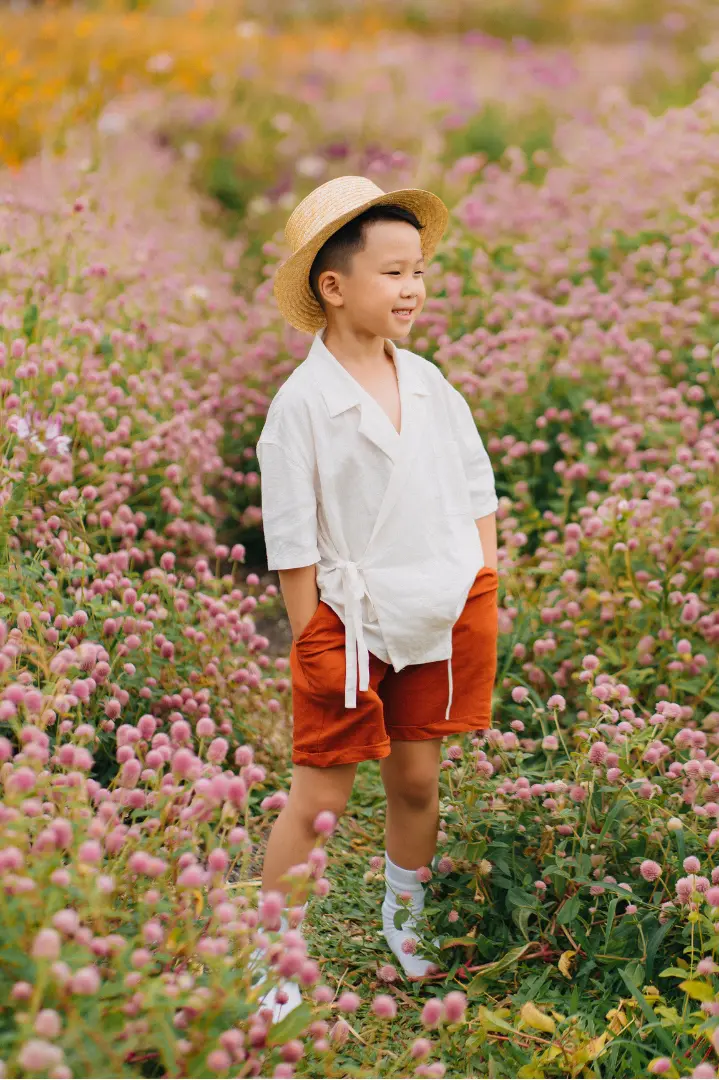 Linen: Được dệt từ cây lanh, có đặc tính kháng khuẩn tự nhiên, thoáng mát và hút ẩm tốt. LINOA chọn linen không chỉ vì sự mềm mại mà còn vì nó “thở” cùng làn da con.