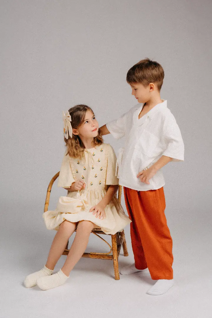 Chất liệu dệt từ sợi lanh tự nhiên, kết hợp sự thuần khiết của thiên nhiên với vẻ đẹp tinh tế, mang đến cảm giác thoải mái, an toàn và sang trọng bền vững cho trẻ em.