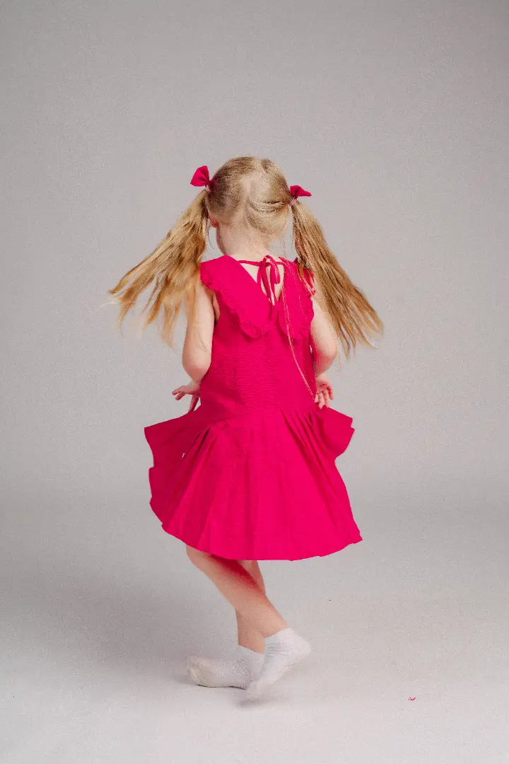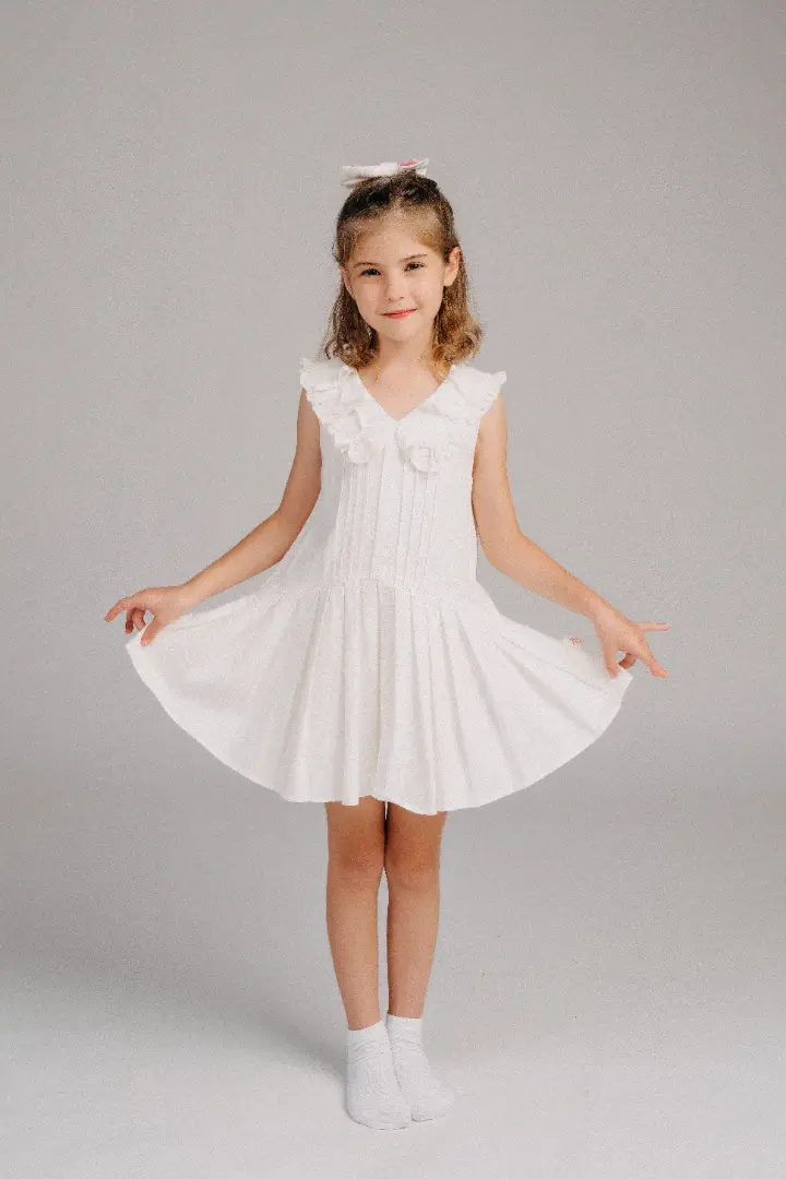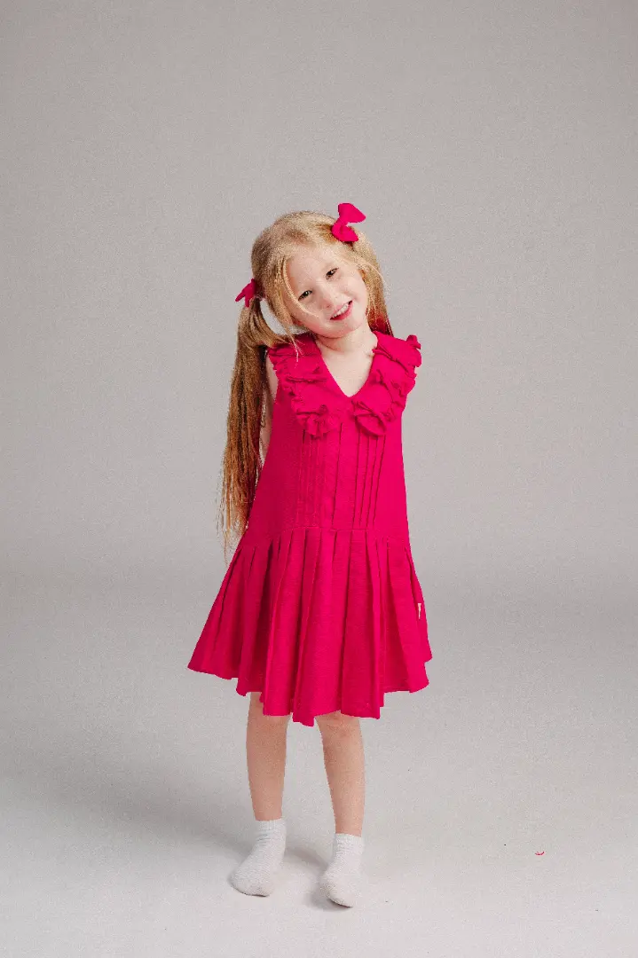 Mang vẻ đẹp rực rỡ và tinh khiết của hoa đỗ quyên, được thiết kế để tôn lên nét đáng yêu, hồn nhiên của bé. Điểm nhấn là các tầng váy xếp ly duyên dáng cùng chiếc nơ nhỏ xinh ở cổ, tạo nên một vẻ ngoài vừa nổi bật vừa ngọt ngào.